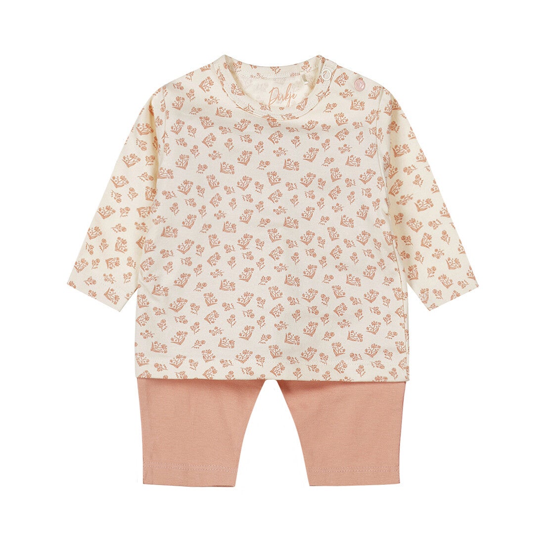Deze meisjes pyjama van Dirkje is gemaakt van een zachte organic cotton met stretch, voor extra comfort tijdens het slapen. Het pyjamashirt is off white met een schattige bloemetjes print en is voorzien van drukkertjes op de schouder. Het pyjamabroekje is oudroze van kleur.