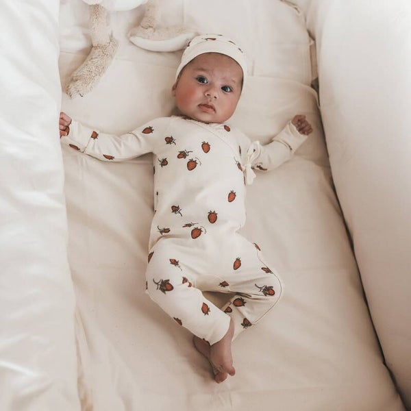 Het mutsje is met een off-white binnenkant een een aardbei patroon aan de buitenkant.
